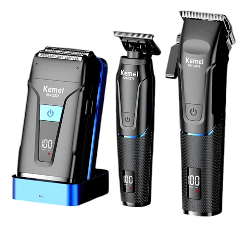 O kit Kemei KM-2375 (preto) é um conjunto profissional 3 em 1, contendo máquina de corte, acabamento e shaver, ideal para uso profissional ou doméstico. A máquina principal possui bateria de 2500 mAh, 210 minutos de autonomia, carregamento USB-C e visor digital LED. Oferece 5W de potência e ajuste de lâmina com 5 níveis.