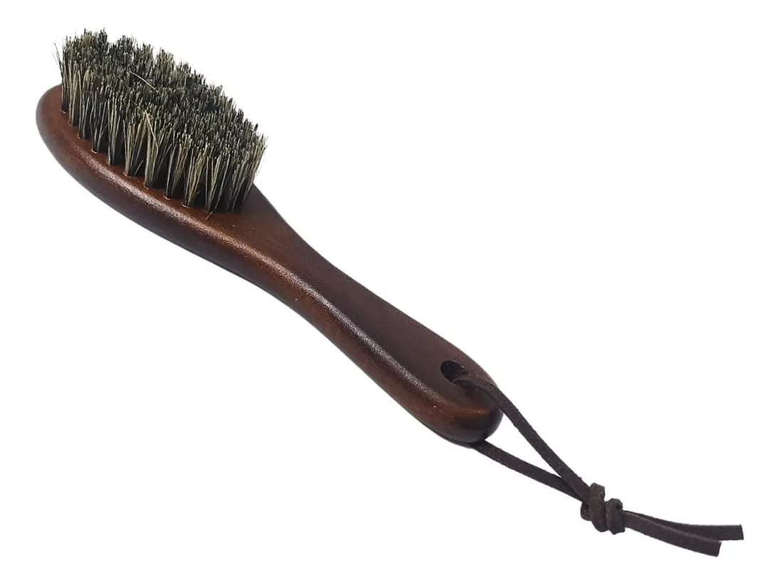 Escovinha profissional com cabo de madeira e cerdas sintéticas macias, ideal para auxiliar no acabamento de cortes com disfarce, degradê, pigmentação e na limpeza de aparos em barbas e bigodes. Seu design compacto e cordão prático facilitam o manuseio e armazenamento, sendo perfeita para barbearias e uso profissional.