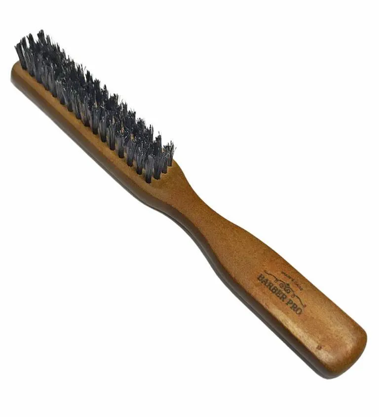 Espanador profissional com cabo longo em madeira natural, desenvolvido para oferecer maior alcance e conforto durante o uso. Possui cerdas sintéticas macias e densas, ideais para remover com eficiência os fios de cabelo cortados do pescoço, rosto e roupas do cliente, sem causar irritação.