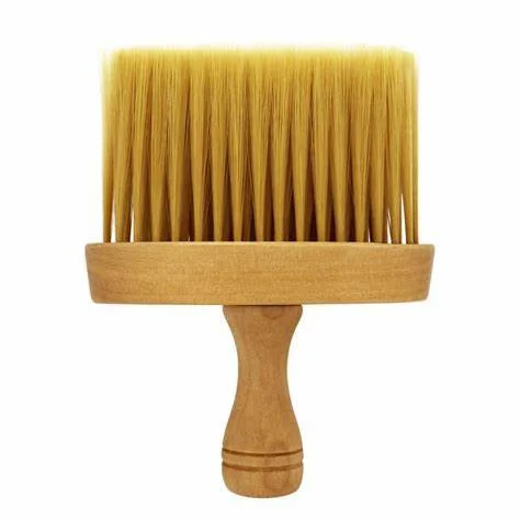 Espanador profissional com cabo em madeira pintada na cor branca e cerdas sintéticas extra macias, ideal para remover fios de cabelo cortados do pescoço, rosto e roupas do cliente. Proporciona um toque suave, evitando irritações na pele, e possui design ergonômico para melhor conforto e controle no uso.
