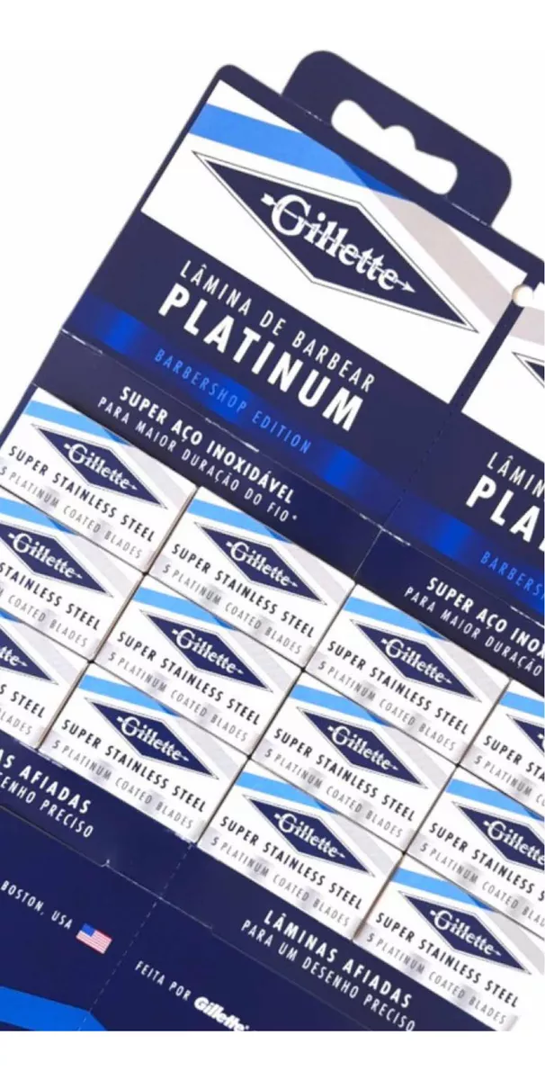 Lâminas de barbear Gillette Platinum de alta precisão, projetadas para oferecer corte suave e rente, garantindo conforto e proteção à pele. Cada caixinha contém 5 cartuchos com 2 lâminas cada, ideal para uso profissional em barbearias ou uso doméstico.