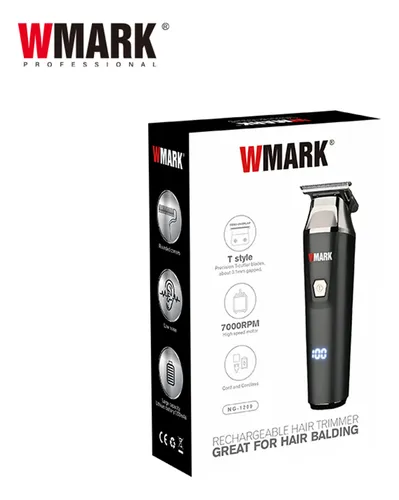 A máquina de acabamento WMARK NG-1209 preta é uma ferramenta profissional sem fio, equipada com lâminas de aço inoxidável em formato T e motor potente de 7000 RPM. Possui bateria de 1200 mAh, oferecendo até 180 minutos de uso com 3 horas de carga, além de visor LED e 3 pentes-guia.