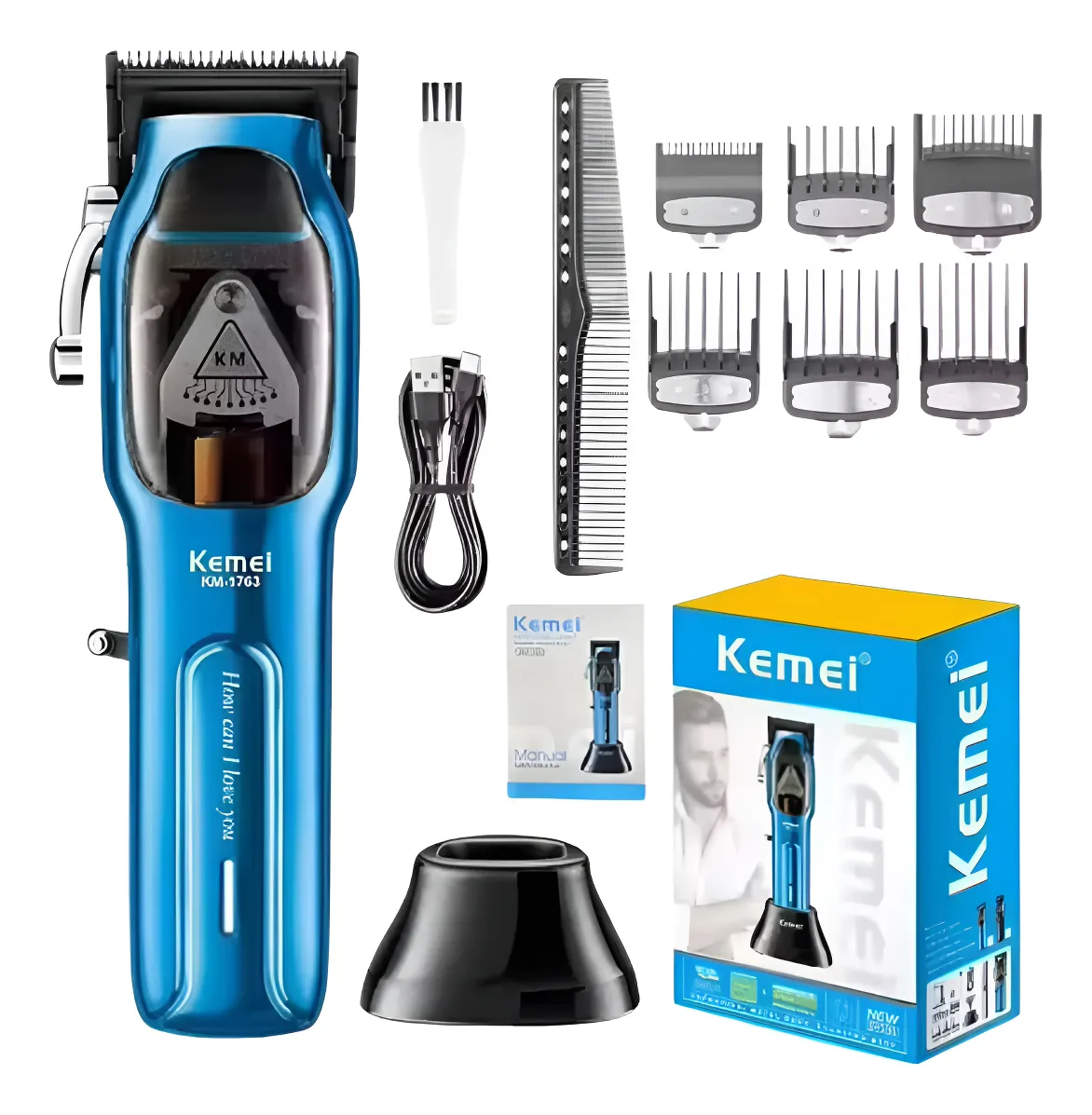 A Kemei KM-1763 é uma máquina de corte profissional equipada com motor magnético potente de 10W, oferecendo cortes rápidos, precisos e contínuos, mesmo em cabelos mais densos.